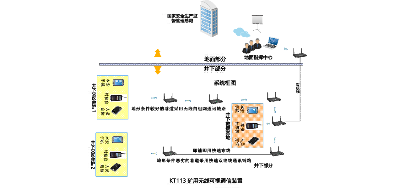 KT113 矿用无线可视通信装置 系统构成:KT113.1矿用本安型通信转换器、KT113.2矿用本安型无线中继器、KT113.3矿用本安型通信计算机、本安型手机、快速布线盘、笔记本电脑功能特点:专一性: 适于矿山救护队的专用可视化通讯系统可靠性: 唯一经过数十次矿井救灾实战的救援可视化指挥系统实用性: 实时动态通讯,即铺即用、随布随传便携性: 单台设备重量均不超过1.8kg灵活性: 可用本安计算机在井下指挥,也可接至地面指挥适应性: 无/有线联合组网,适应井下绕道、风门等复杂环境互动性: 无线摄像机带屏显,定位好,与指挥方实时沟通准确易用性: 远距离传输采用双绞线,避免了光缆的安装维护难题延伸性: 解决了Mesh网络多级无线传输带宽衰减快的问题兼容性: 支持WiFi Mesh、以太网、RS485等网络通信标准
