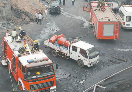 陕西韩城小南沟矿电缆火灾事故救援 2010年7月17日,小南沟矿副斜井井底发生电缆着火事故,导致木棚支架着火,井下火势难以控制,大量烟雾溢出井口,井下救援工作无法进行。由于火区温度高、波及范围广、供氧充分、发展速度快,治理难度极大。公司专家团队经过分析,采用液态二氧化碳等多项火势控制措施,仅用三天时间就完成了救援工作,受到省煤监局和地方政府领导的高度评价。 注:图为小南沟救援现场